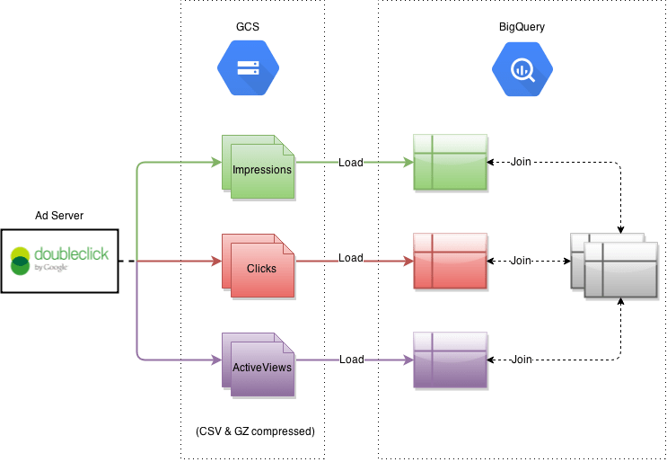 The test we wanted to throw at Dataflow was quite simple, but it also packed enough punch to make a worthy adversary, and put Dataflow through its paces. On a previous project, we had successfully used BQ to grind through massive datasets of ad-serving logs, which had billions of rows and TB’s of data – in about 30 seconds. Don’t believe me!? Here. The ad-serving logs were pumped directly into Google Cloud Storage (GCS) from Double Click for Publishers (DFP), and were made up of 3 distinct sources: