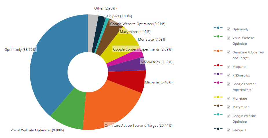 Worth mentioning: Google Content Experiments is free. And if you are wondering which is the most popular offering, trends.builtwith.com tells us that Optimizely is the hottest at the moment:
