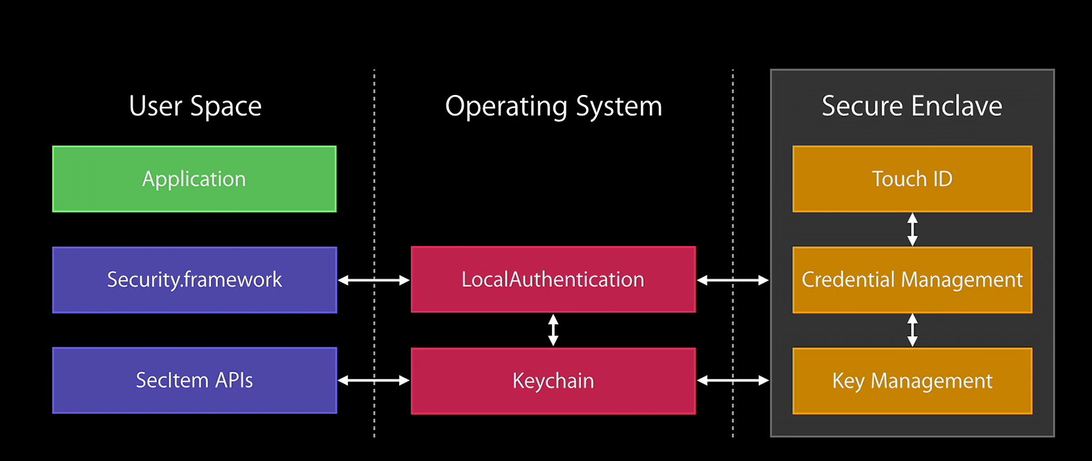 - It then retrieves the encrypted item from the Keychain, and passes it to the Secure Enclave, which then prompts for Touch ID authentication, depending on the ACL you set.