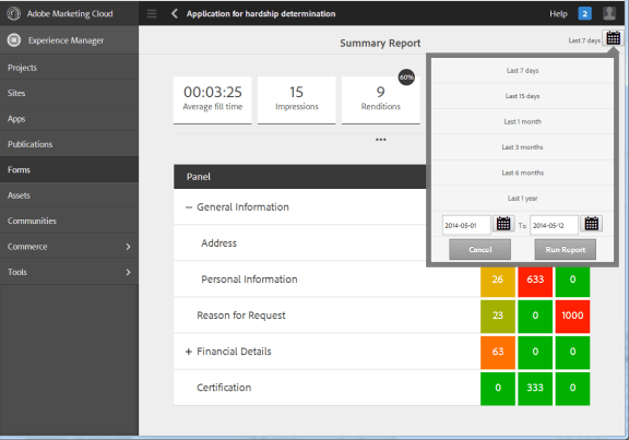A screenshot of an Adobe Forms analytics report (source: https://helpx.adobe.com/aem-forms/6/view-understand-aem-forms-analytics-reports.html)