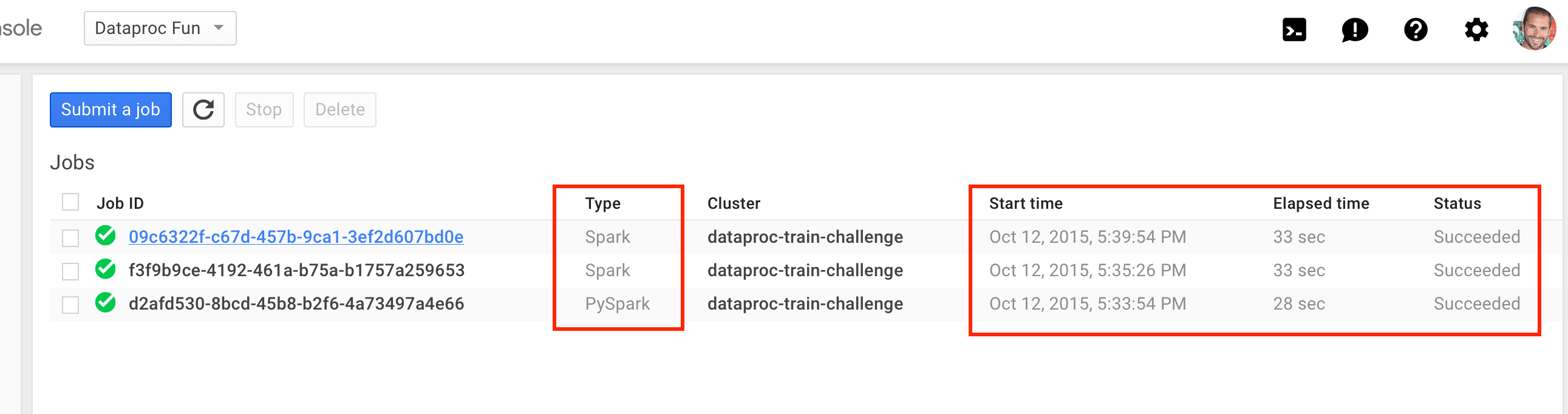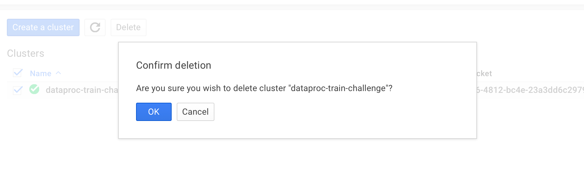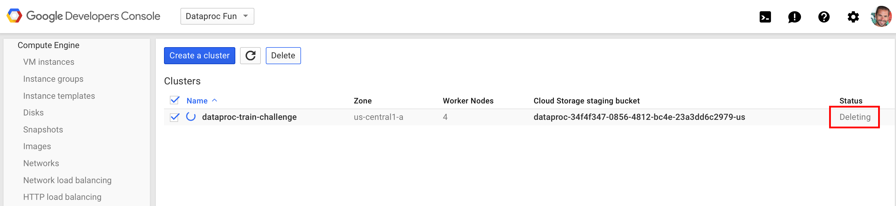There are multiple ways that Google provide to delete the cluster i.e. from the command line, REST API or from the web UI. I only had enough time left for the latter, so I selected the cluster I had created (dataproc-train-challenge), and finally clicked Delete:
