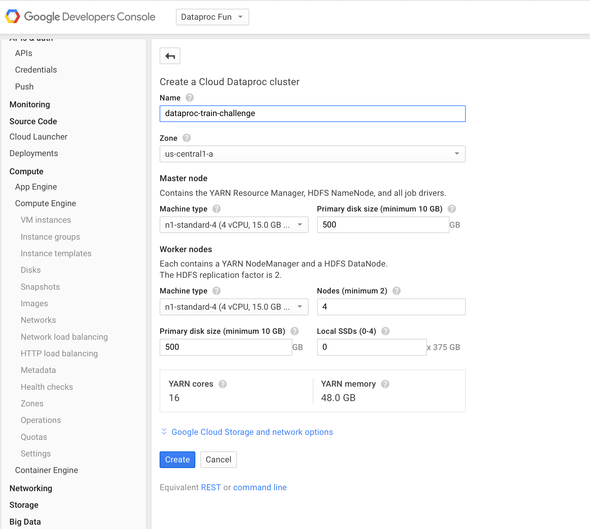 Finally,  I left everything else as default e.g. the default instance type n1-standard-4 (4 vCPU & 15GB RAM), and primary disk size of 500GB etc. That configuration resulted in my Dataproc cluster weighing it at 16 YARN cores, and 48GB of YARN memory.
