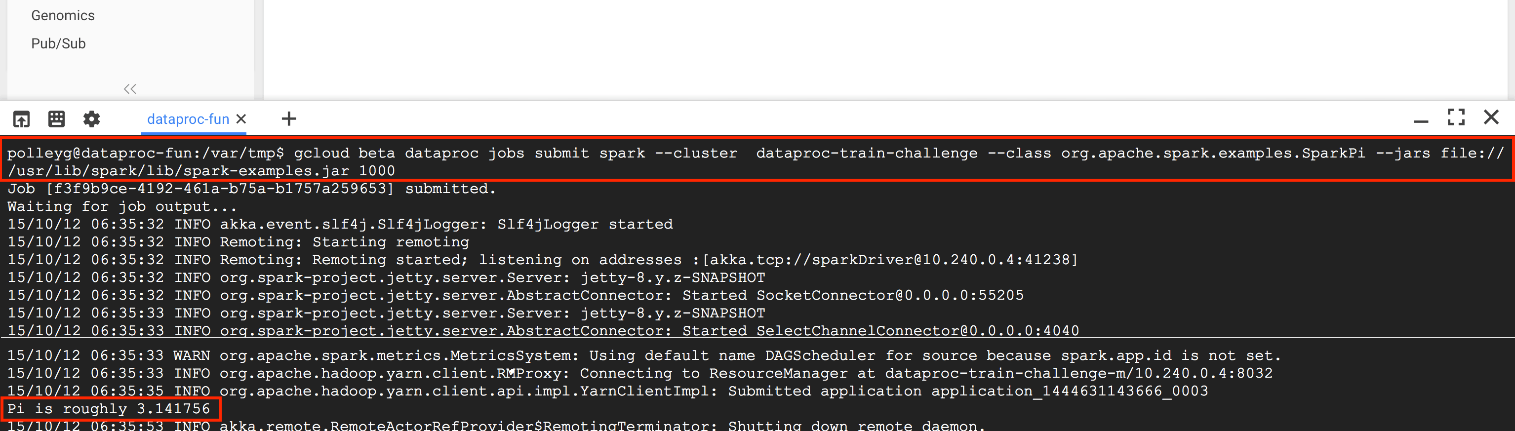 Next up, I ran the Spark job. The file:/// notation you see below denotes a Hadoop LocalFileSystem scheme; Cloud Dataproc installs /usr/lib/spark/lib/spark-examples.jar on the cluster’s master node when it creates the cluster: