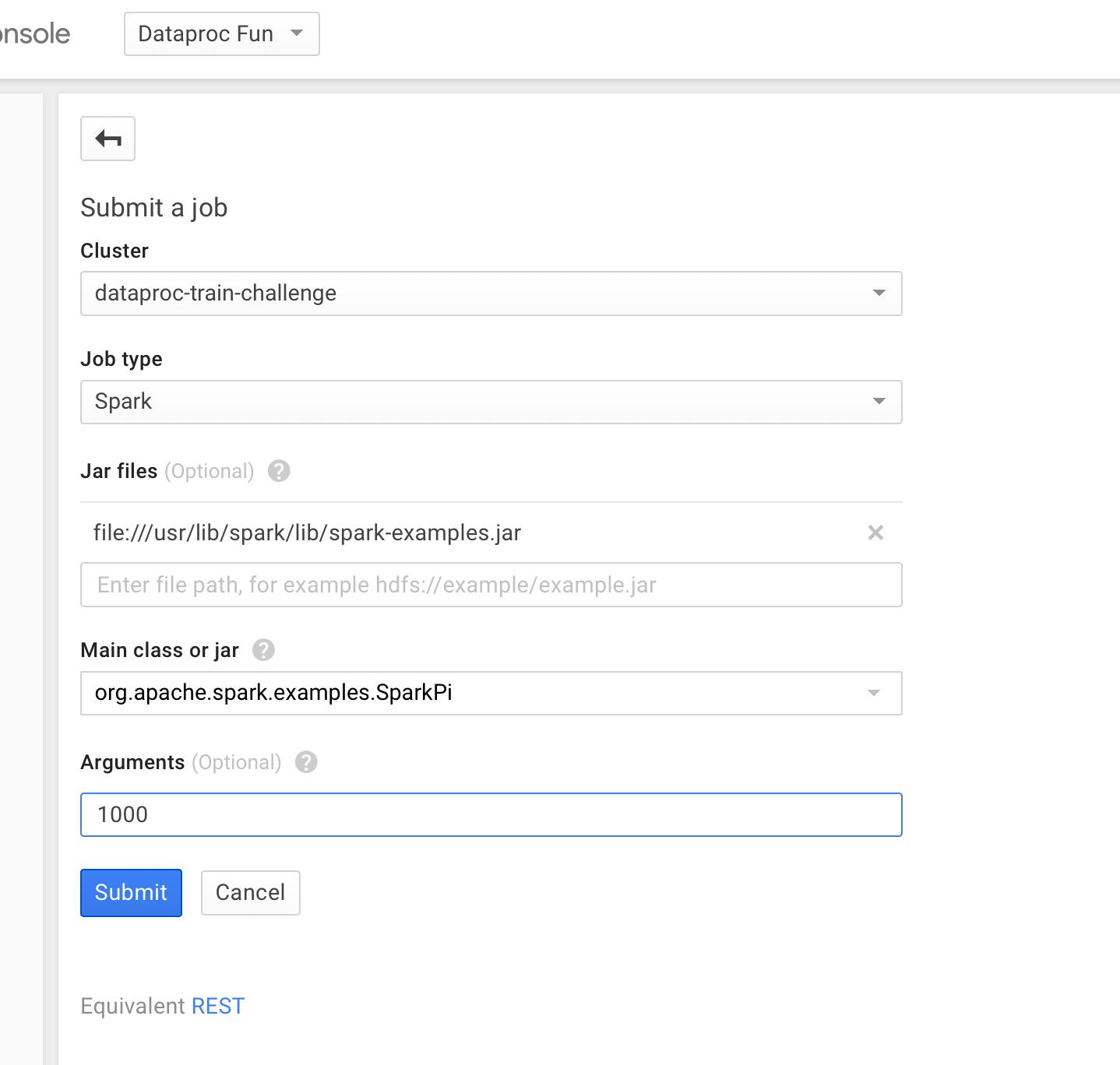 I flicked over to the web UI, and quickly clicked on Submit a job. I then proceeded to fill in all the details needed as quickly as humanly possible e.g. cluster name, main class etc. to run the Spark PI example job once again: