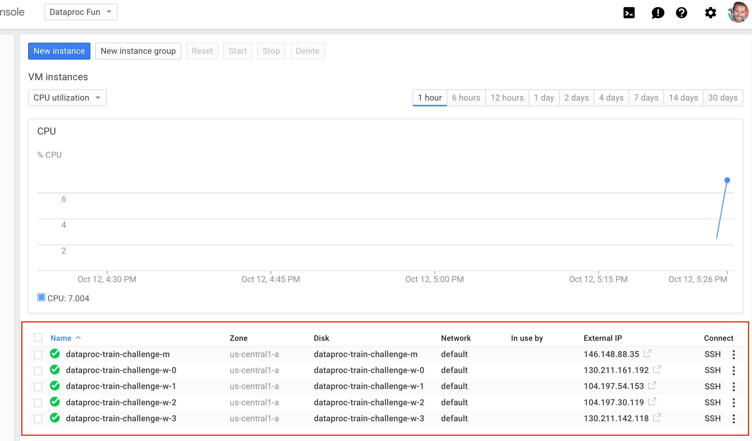 I clicked on VM Instances in the GDC, and lo and behold I could see all 5 of my cluster instances listed there. The master is easily identified as the instance with the m suffix, and the rest are the workers with the w suffix. Looking at the them in the GDC, all 5 instances looked healthy: