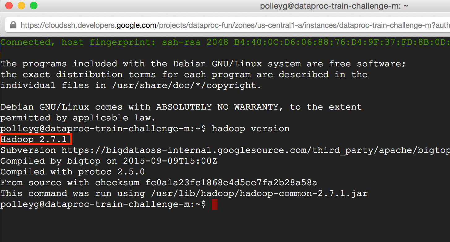 If you look closely at the screenshot above, you’ll notice the conveniently placed SSH link right there next to each instance. I wouldn’t have to waste any time tabbing between my Terminal and the browser. Sweet! So I clicked SSH next to the master, and the connection was established – albeit pretty slowly. Then I ran the following trivial command to check the Hadoop installation:
