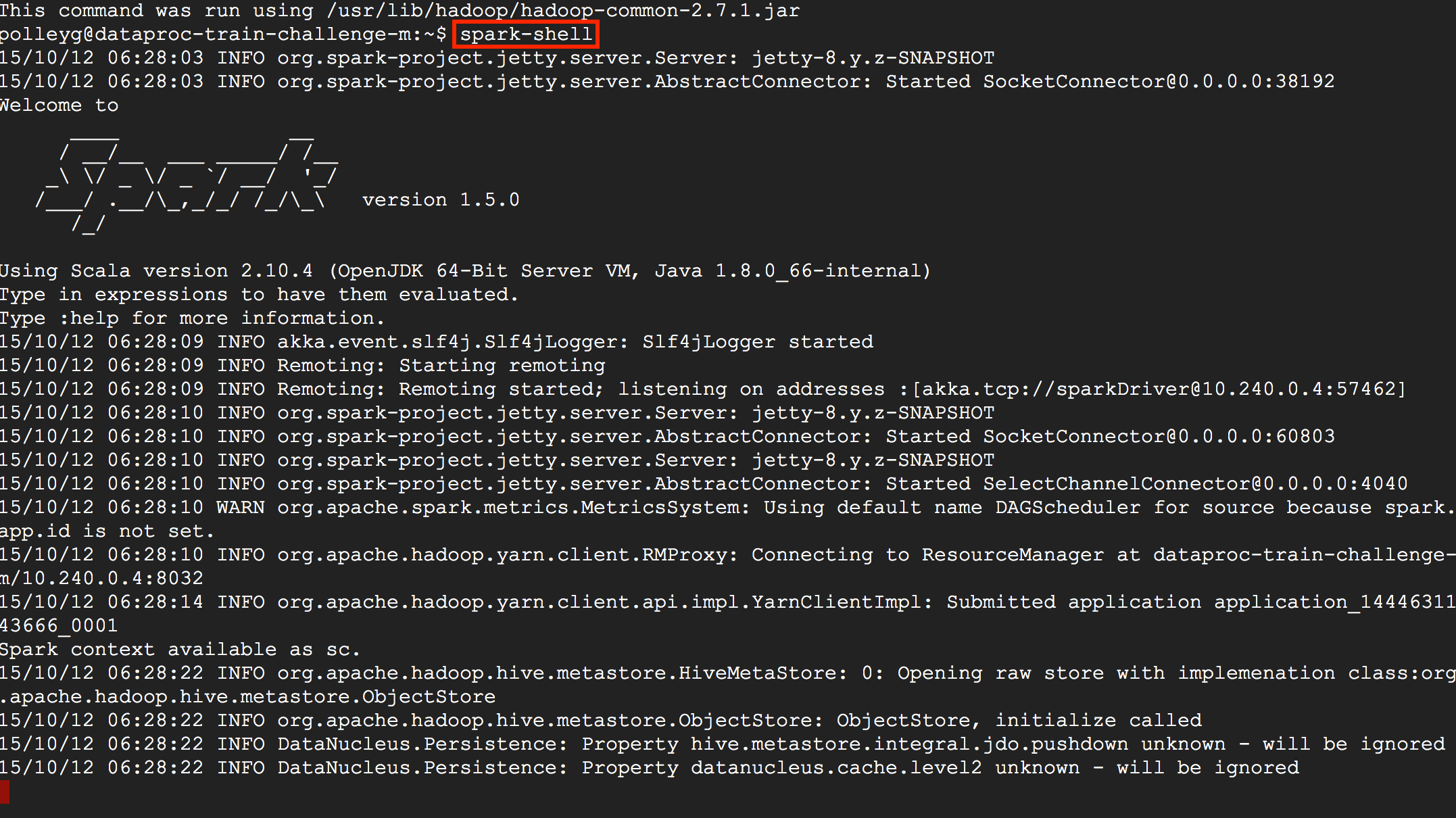 Hadoop installation looked good. Next up, I wanted to check that Spark was also installed alongside successfully. Using the same SSH session I had just used to check the Hadoop installation, I ran the following command to fire up the Scala REPL for Spark: