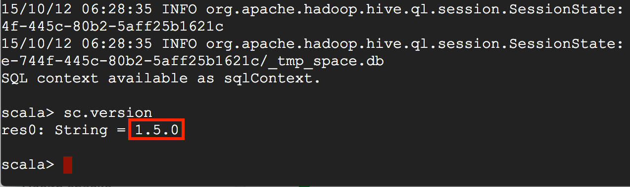 Ok, so while the Spark shell was fired up, I took the opportunity to quickly test it by running the following command which should return the Spark version: