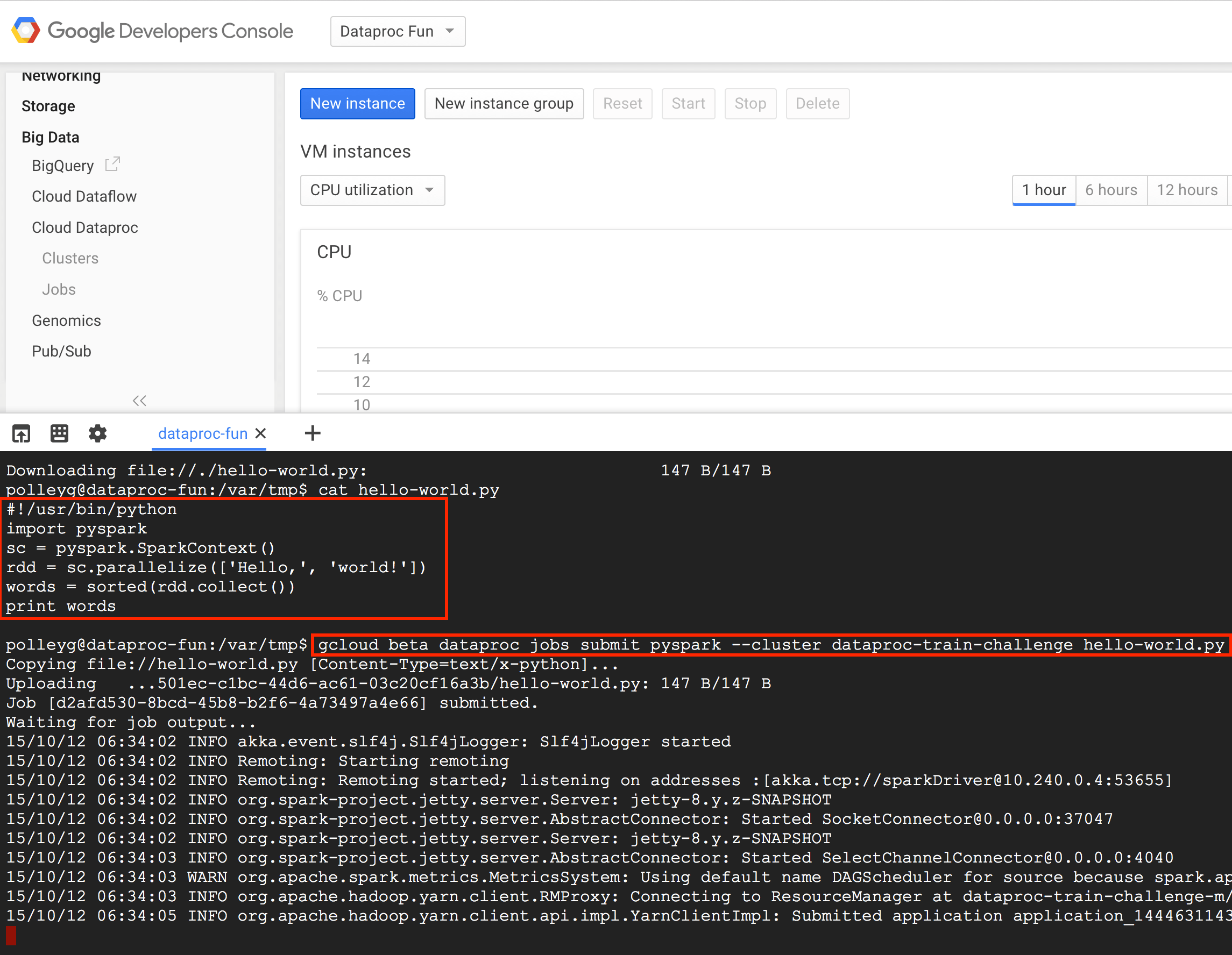 [code language=”bash”]gcloud beta dataproc jobs submit pyspark –cluster dataproc-train-challenge hello-world.py[/code]